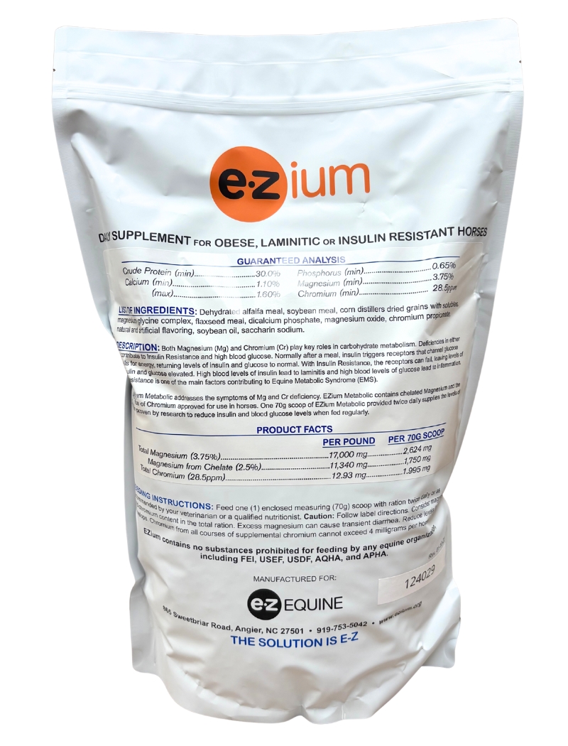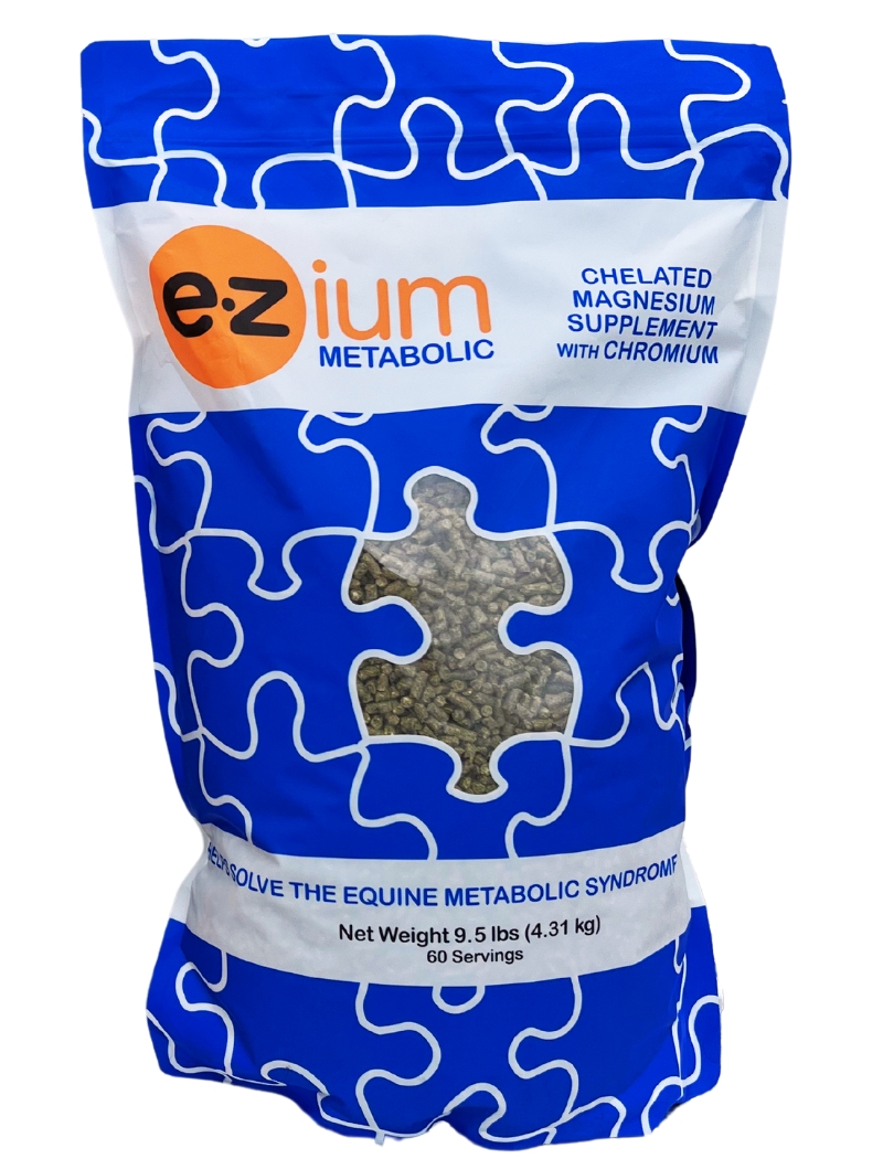 EZium Metabolic is a daily magnesium supplement with added chromium. Elevated levels of insulin and glucose are typically associated with Equine Metabolic Syndrome (typified by obesity, insulin resistance, laminitis). When under stress, horses release the stress hormone cortisol. The form of chromium in EZium Metabolic has been proven to reduce not only insulin and glucose but also cortisol levels in the blood. Feeding EZium Metabolic daily reduces the negative health impacts associated with magnesium and chromium deficiency in obese, laminitic, insulin-resistant, and horses under extreme stress.
